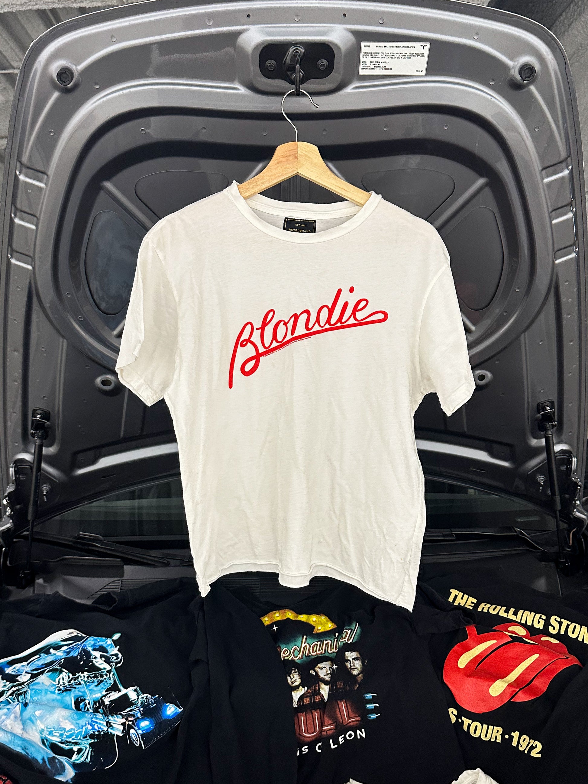 Featuring the iconic Blondie logo in bold red script on a soft white fabric, this vintage-style tee combines effortless cool with retro flair. Made from a comfortable and lightweight cotton blend. Women's size Small with a slightly relaxed fit