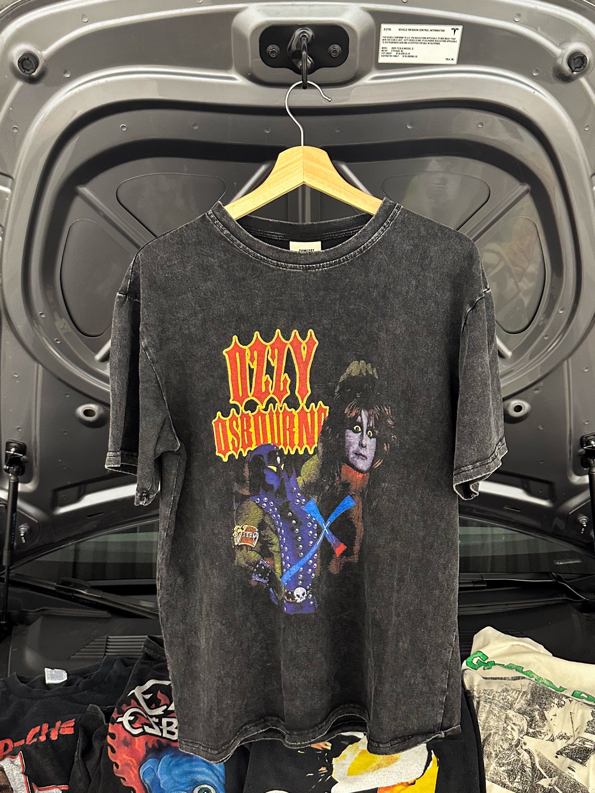 Channel the raw energy of early-80s heavy metal with this bold, dual-sided graphic tee. Its front flaunts the striking “Diary of a Madman” album art—Ozzy’s fierce visage, wild-eyed and haunting, rendered in neon hues that glow against deep black fabric. On the back, a spanning logo and tour motif deliver that classic vintage merch vibe.